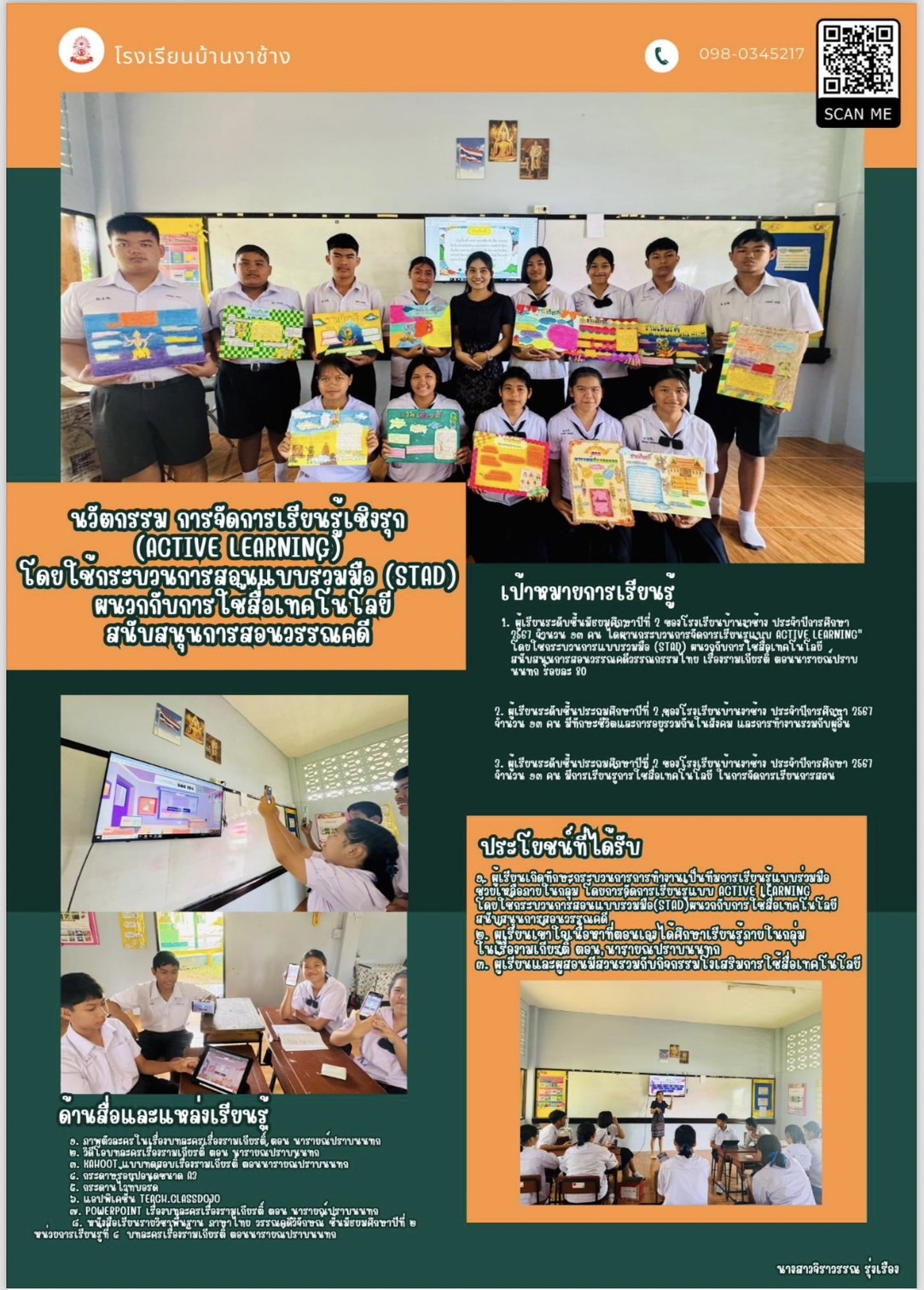 ชื่อผลงาน : นวัตกรรม การจัดการเรียนรู้เชิงรุก (Active learning) โดยใช้กระบวนการสอนแบบร่วมมือ (STAD) ผนวกกับการใช้สื่อเทคโนโลยีสนับสนุนการสอนวรรณคดี